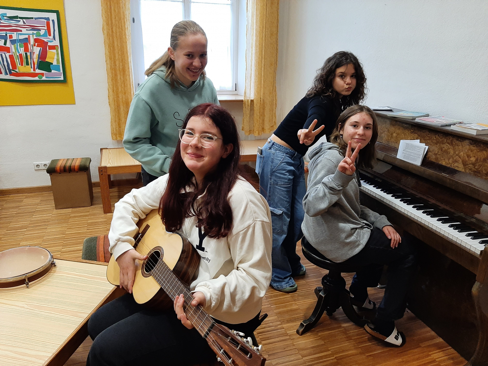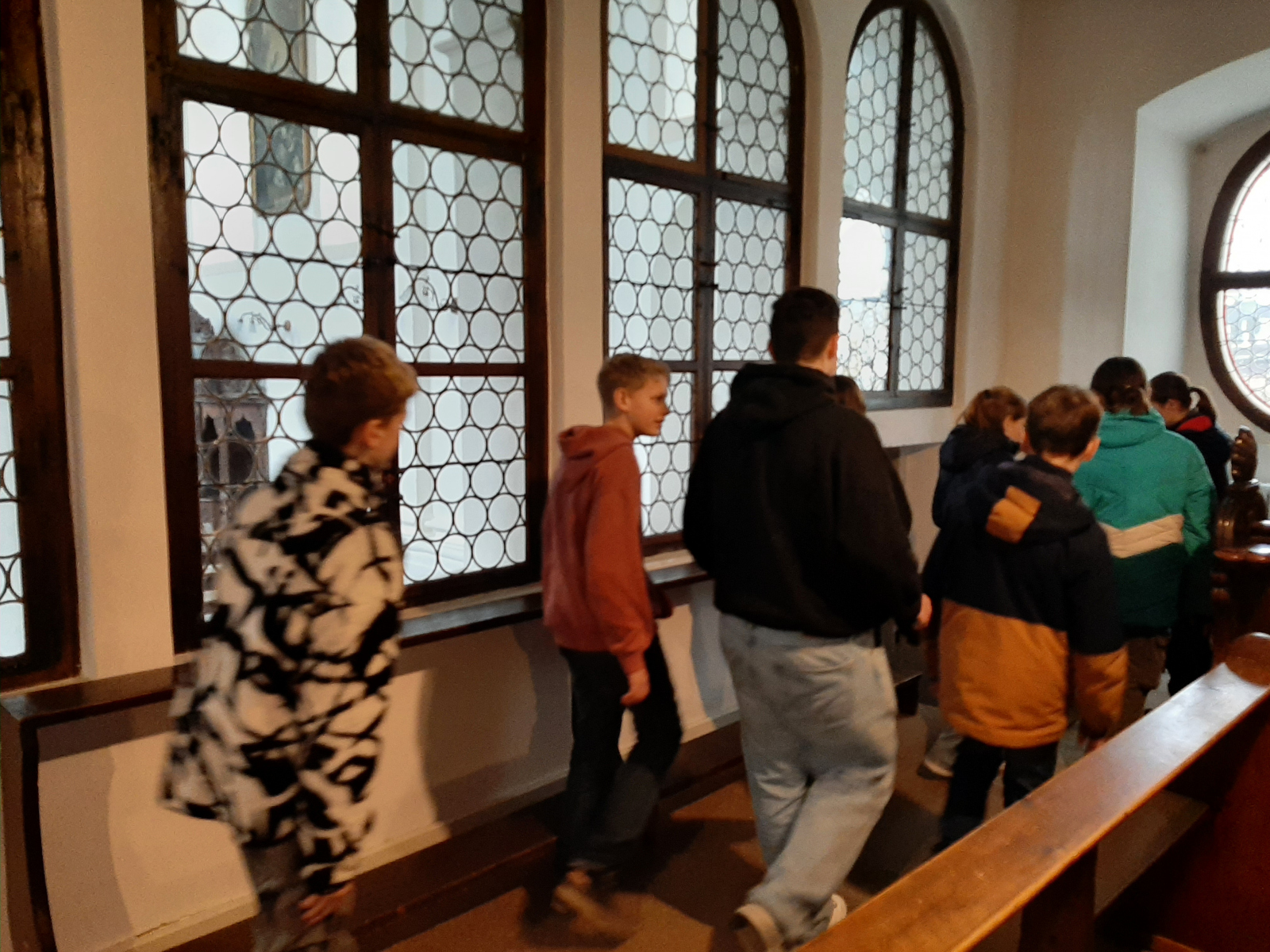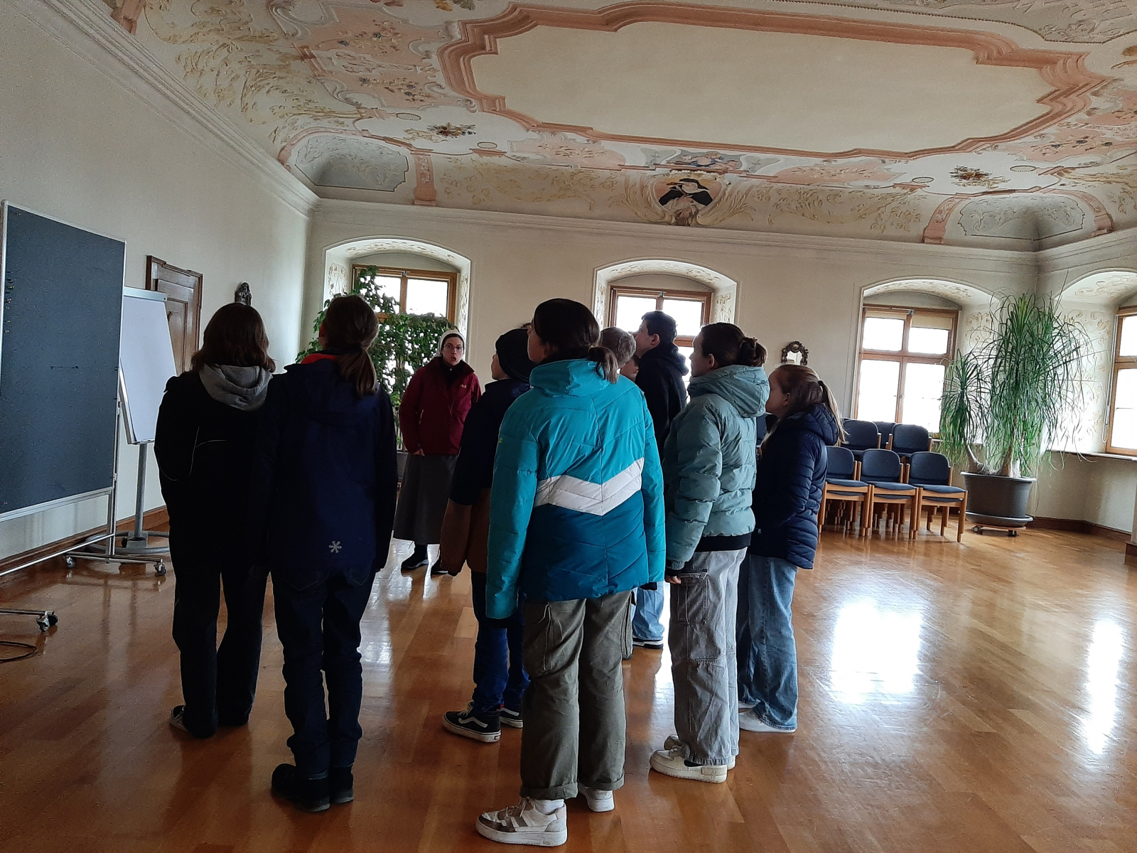 Von 8.45 Uhr bis 11.45 Uhr erwartete die Schülerinnen und Schüler dort ein spannendes Programm rund um den Heiligen Franziskus und das Klosterleben. Nach einem Aufwärmspiel im Jugendhaus gelang es den Schwestern mithilfe einer Marionette, die den Heiligen Franz von Assisi verkörperte, das Leben des Letzteren auf eine lebendige Art und Weise darzustellen. Aktiv einbezogen wurden die Jugendlichen, als es darum ging, sich in den Heiligen Franziskus hineinzuversetzen und sich Gedanken zu überlegen, die dem Heiligen an bestimmten Stationen seines Lebens durch den Kopf gehen können hätten. Angeregt durch die Frage, ob es denn heutzutage immer noch möglich sei, die Stimme Gottes zu hören, folgte daraufhin in einer Grotte eine Art Meditation, in der jeder die Möglichkeit hatte auf verschiedene Impulse zu reagieren und so Sinneseindrücke sensibler wahrzunehmen. Nach einer Stärkungspause, in der viele auch das Angebot nutzten und sich im Tischkickerspielen und Musizieren übten, stand schließlich eine Führung durch sämtliche Räumlichkeiten des Klosters an. Dabei erfuhren die Siebtklässler unter anderem wissenswerte Hintergründe zu den örtlichen Gegebenheiten, wie zum Beispiel zu einzelnen Gestaltungselementen der beeindruckenden Barockkirche. Zudem erhielten sie einige interessante Einblicke, was das Klosterleben an sich angeht. Beispielsweise wurde früher nicht nur in der Barockkirche oder in der Kapelle gebetet. Vielmehr versammelten sich die Nonnen zu Andachten auch in einem speziellen Gebetsraum mit Klappsitzen. Im Zusammenhang damit kam es auch zur Entstehung der Redewendung „Halt die Klappe!“. Schließlich wollten die Nonnen in ihrem Gebet nicht dadurch gestört werden, dass Mitschwestern ihre Sitzklappen beim Aufstehen lautstark gegen das Holz knallen ließen anstatt sie festzuhalten. Dass jede Nonne erst einmal eine Art Probezeit durchlaufen und vor der Einkleidung einen neuen Namen aussuchen muss, bevor sie auf Lebenszeit in den Orden aufgenommen wird, fanden die Teilnehmer ebenso heraus. Zum Abschluss wurde eine Feedbackrunde durchgeführt. Daraufhin traten die Jugendlichen mit zahlreichen neuen Eindrücken im Gepäck verteilt auf Elterntaxis letztlich wieder den Heimweg an.